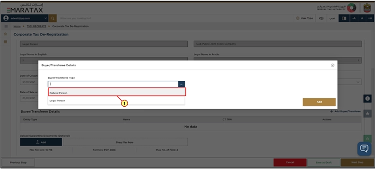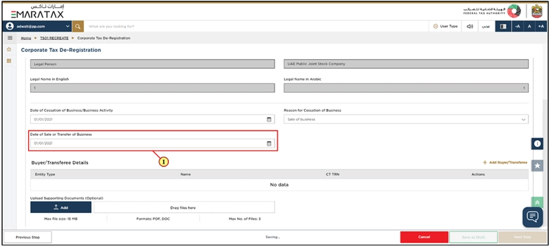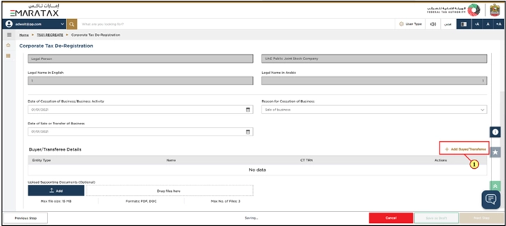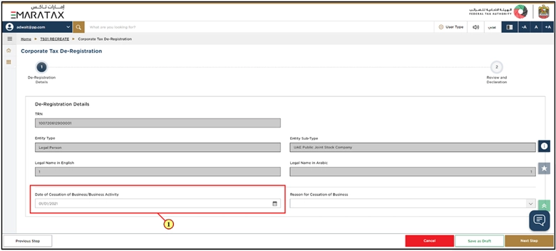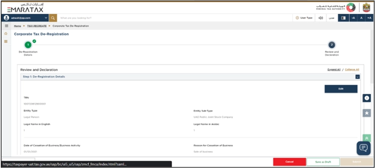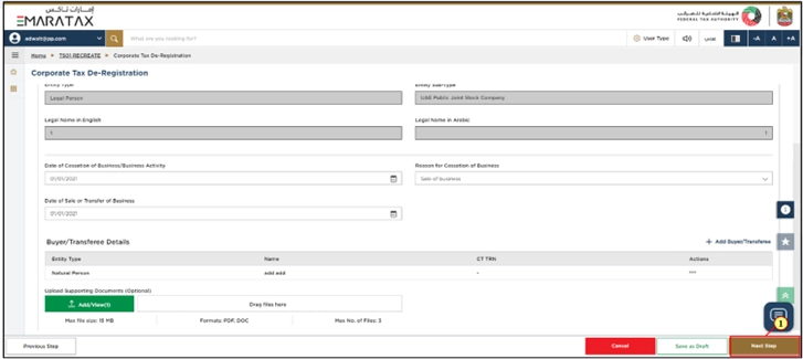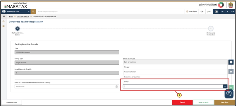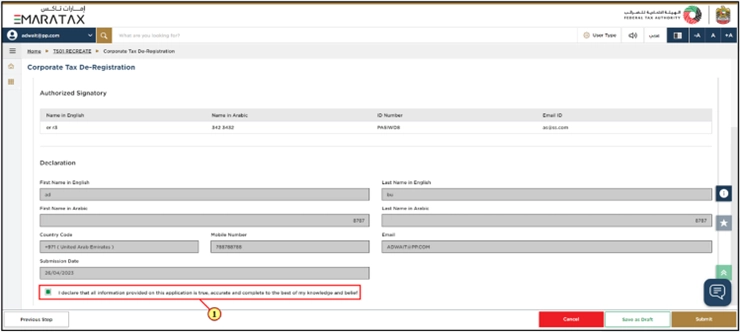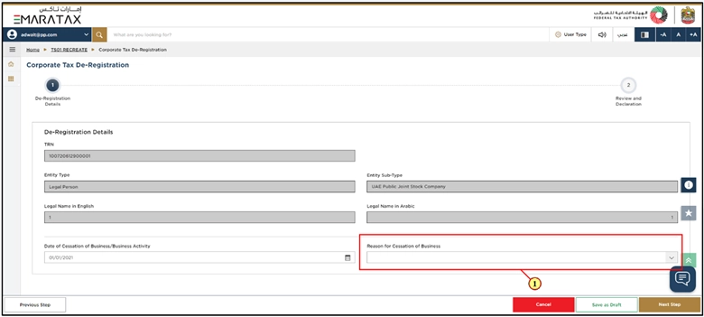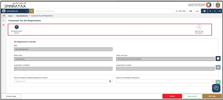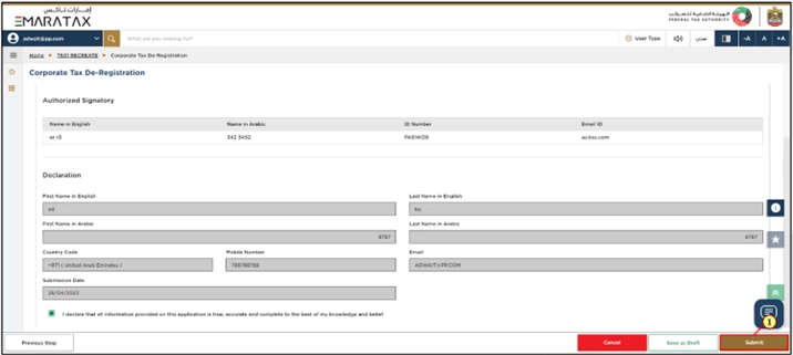 - Your Corporate Tax registration details are already filled in automatically in the De-Registration form.