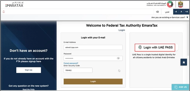 You can sign in to your EmaraTax account either with your username and password or through UAE Pass. If you are unable to remember your password, you can use the ‘Forgot password’ option to set up a new password for your account.
