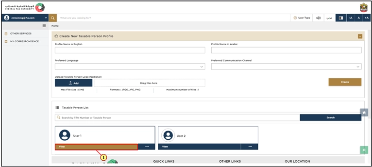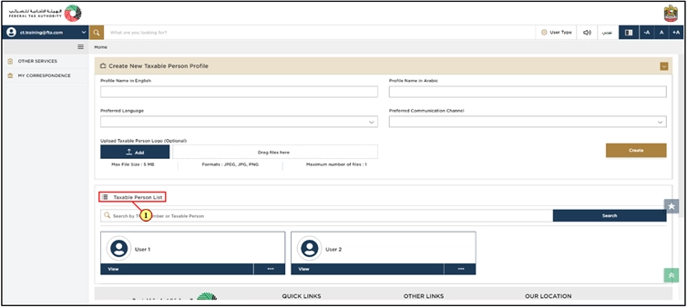 After you log in, you will see the Taxable Person list. This shows all the Taxable Persons connected to your EmaraTax profile.