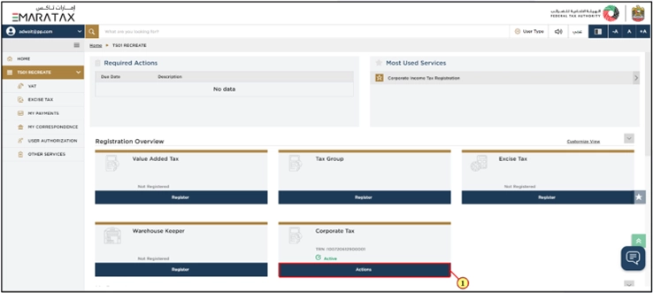 To begin the Corporate Tax De-Registration process, open the Taxable Person Dashboard and choose ‘Actions’ under the Corporate Tax section.