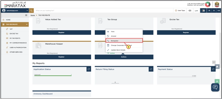 Select ‘Deregister’ to begin the Corporate Tax Deregistration process.