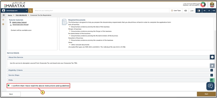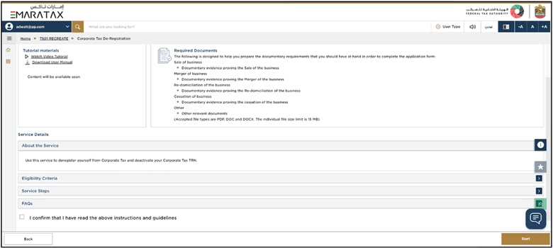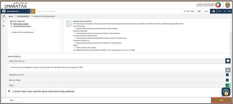 If you want to initiate the Corporate Tax De-Registration process, then click the ‘Start’ option.