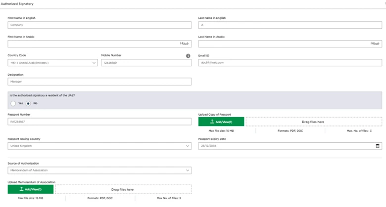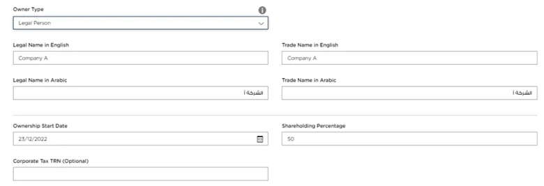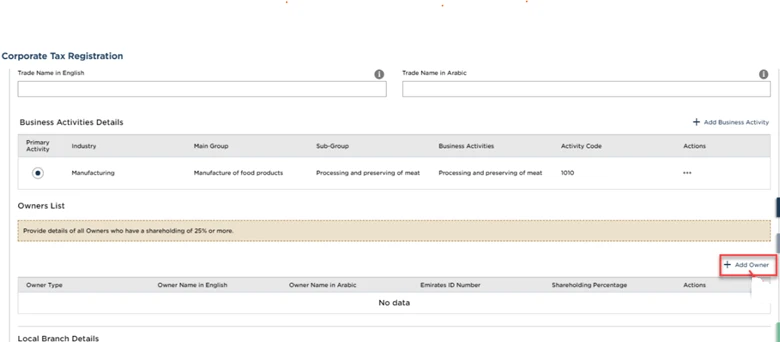 Next, provide details from your trade license, including your business activities and whether you have any branches. Upload a copy of the license and enter your company’s legal name in both English and Arabic. You must also add owners who hold 25% or more than 25% shares of the company.
