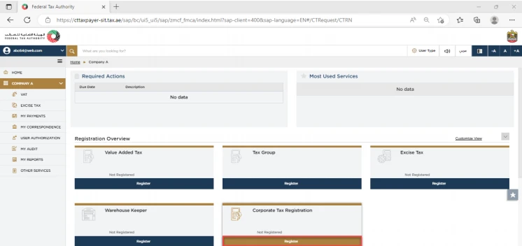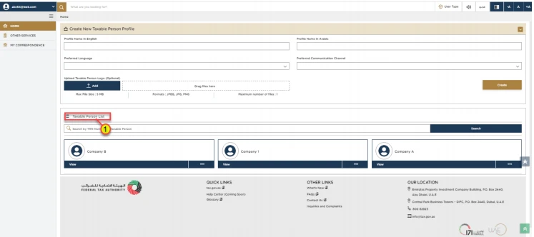 Once you log in, you will see a taxable person list. Click on this list and it will show you if any taxable person is linked to your user profile. If you are a new registrant, this list will be empty and now you need to add your business as a taxable person. Once you have created the taxable person, go to the corporate tax section and choose the option for registration for corporate tax. The system will show you a checklist of the documents you need and FAQs to guide you through the process.