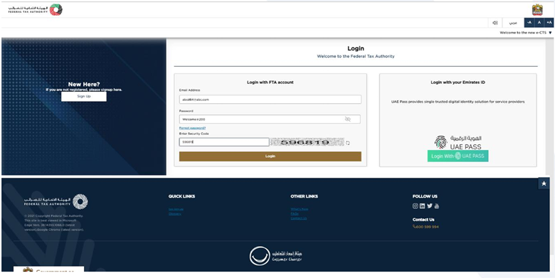 There are 2 ways to log in to your EmaraTax account. First, by using your username and password, and second, by using UAE Pass. If you currently don’t have an EmaraTax account, then simply click Sign Up button to create a new account. Sometimes, users forget their EmaraTax account password and can’t recall it. In this case, just use the Forgot Password option to reset it and regain access to your account.