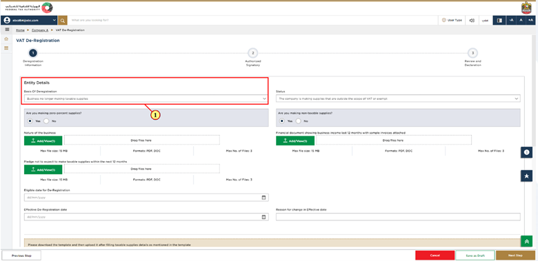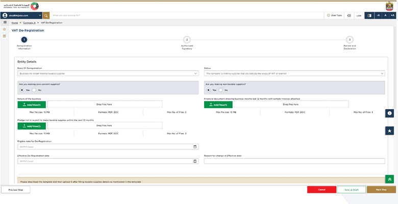 Select the basis on which you are deregistering from VAT. Depending on the reason you select for deregistration, the relevant fields and sections will appear on the screen. You will need to fill in the required details and upload all the necessary supporting documents. Different reasons have different requirements, and according to your selection you will be required to prepare and provide the requested information.