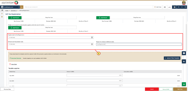The date when a Taxable Person can or must deregister depends on the reason chosen for deregistration. Enter the date you are eligible for deregistration. EmaraTax will then automatically fill in the effective deregistration date based on the date you entered. If needed, you can change the effective deregistration date but you will need to provide a reason for the change.