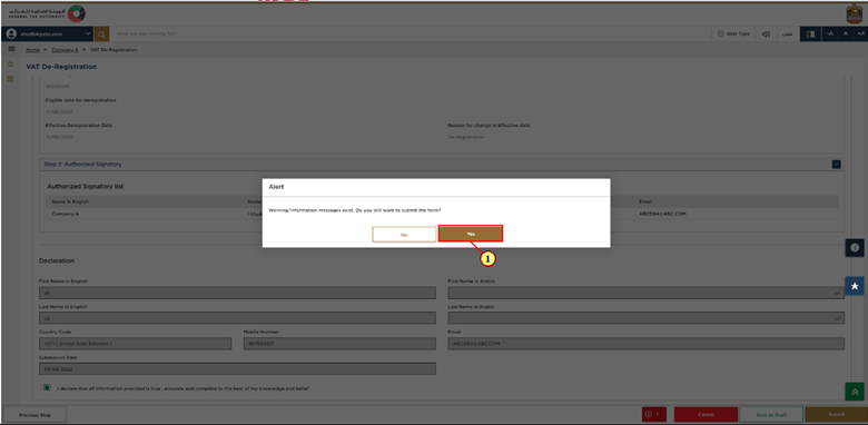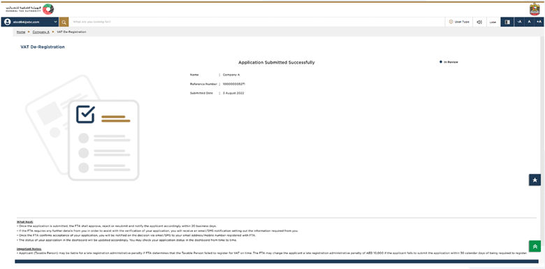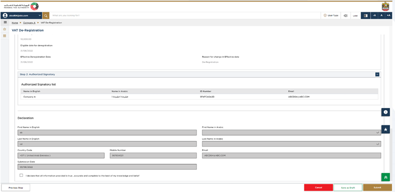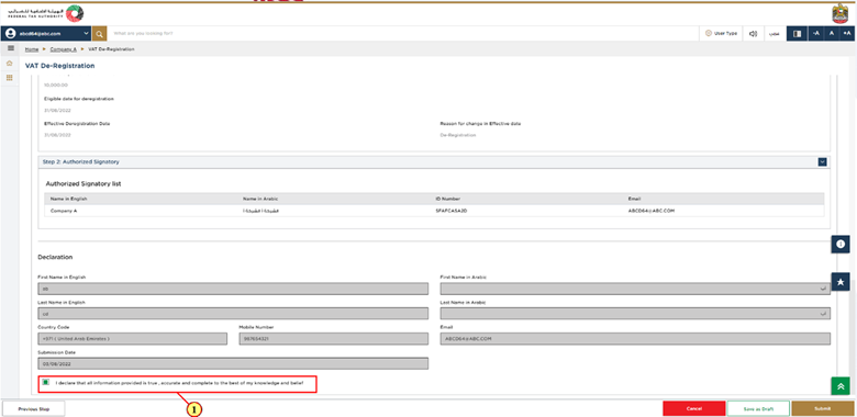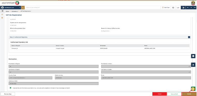 This is the final step which shows all the details you have entered in the application for VAT deregistration. Please review everything carefully and in case any change is required, make that change before you submit the application.