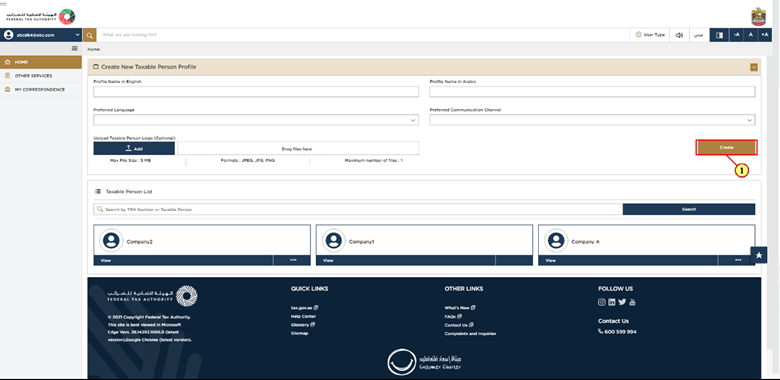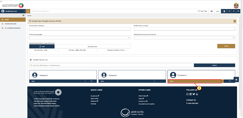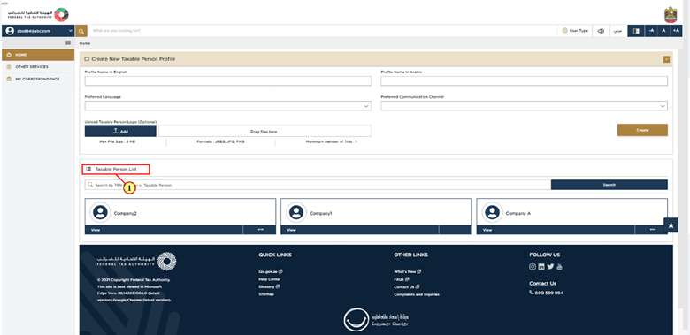 After you have logged in successfully, you will see the Taxable Person list, which shows all the Taxable Persons linked to your EmaraTax account. If the list is empty, then this means there are no Taxable Persons linked yet, and you will need to create a Taxable Person to proceed.
