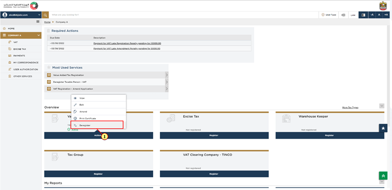 In order to begin the VAT Deregistration process, you will see an option of Actions on the VAT tile. Simply, click on it and select the Deregister option.