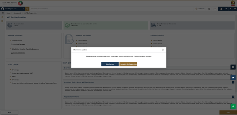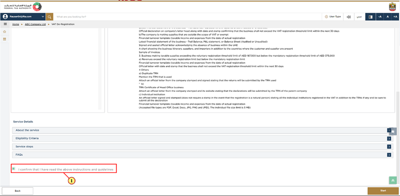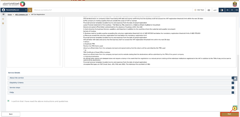 The guidelines and instructions page is basically designed in a way to help users understand the key requirements for VAT Deregistration in UAE. It is also helpful because it provides guidance on what information the user should have in order to complete the deregistration process and application.
