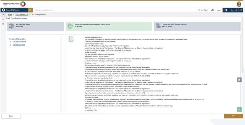 You see an option of Start in the bottom right corner of your screen, click on it to begin your VAT Deregistration application.