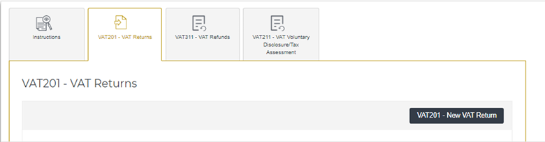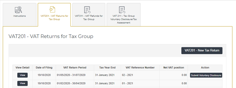 If you have registered a Tax Group and act as its representative, you can create and access the VAT Return through the “VAT201 – VAT Returns for Tax Group” tab.