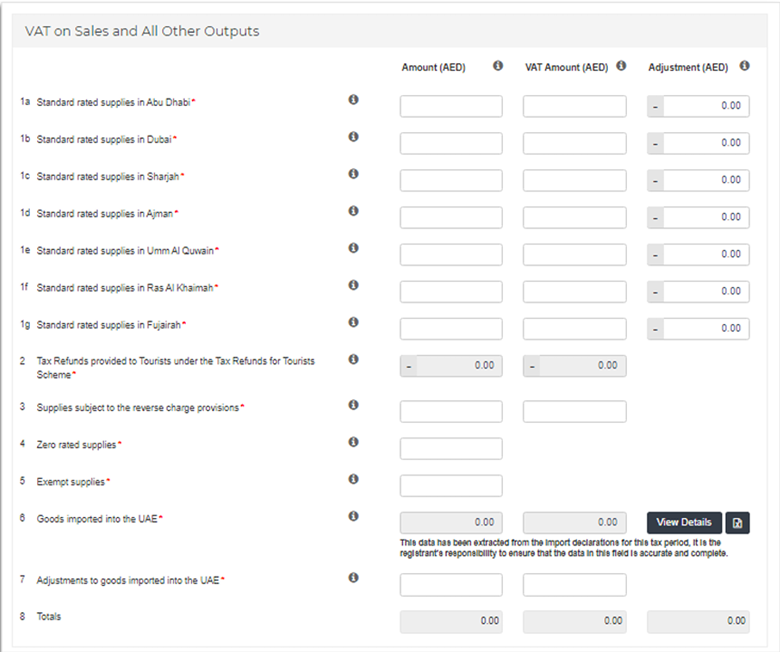 Amount (AED): Enter all sales and output amounts excluding VAT and report them for each Emirate as required by the VAT laws.